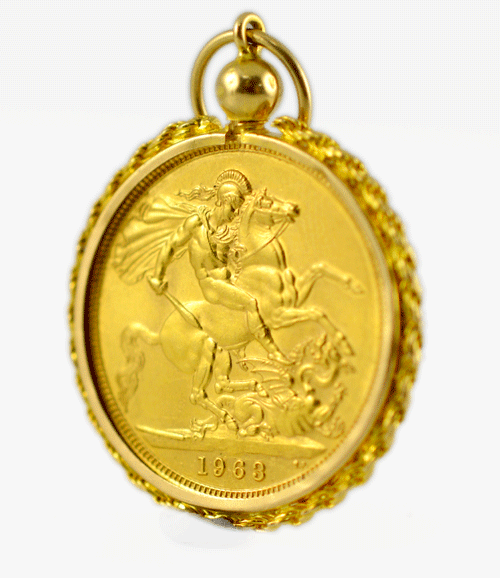 genuine Elizabeth R 22kt full gold sovereign coin in 18kt gold ornate twisted gold pendant with iconic Benedetto Pistrucci designed St George. 1963 issue. 9.26gm